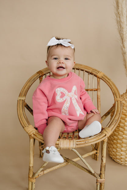 Get out of the winter blues with our Applique Floral Bow Sweatshirt Romper! This sweatshirt features a charming, embroidered bow applique design, bringing a cozy and cheerful vibe to your cold weather wardrobe. Made from a soft, high-quality fabric, it offers warmth and comfort for all your activities, from family gatherings to cozy days at home. The classic crewneck style and relaxed fit make it easy to layer over your favorite tops or wear alone, while the eye-catching design adds a touch of seasonal flair.
