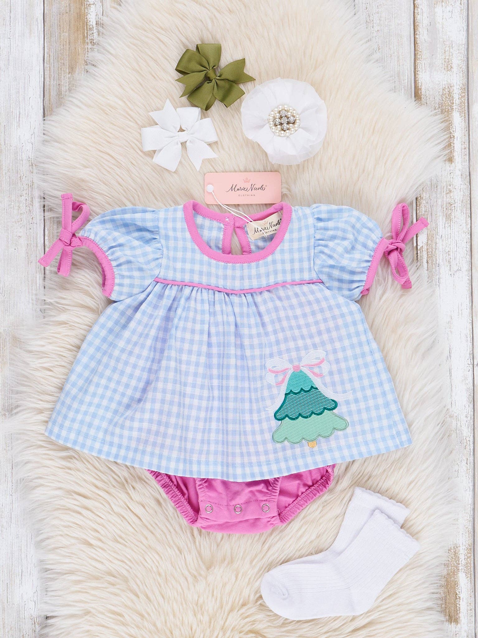 Get your little girl in the holiday spirit with this playful Blue Gingham Christmas Tree Bubble! The blue gingham bodice and pink accents add a touch of quirky charm, while the embroidered Christmas tree makes it extra festive. Don't forget to check out the matching sister set! * Snap buttons. * Fits true to size.