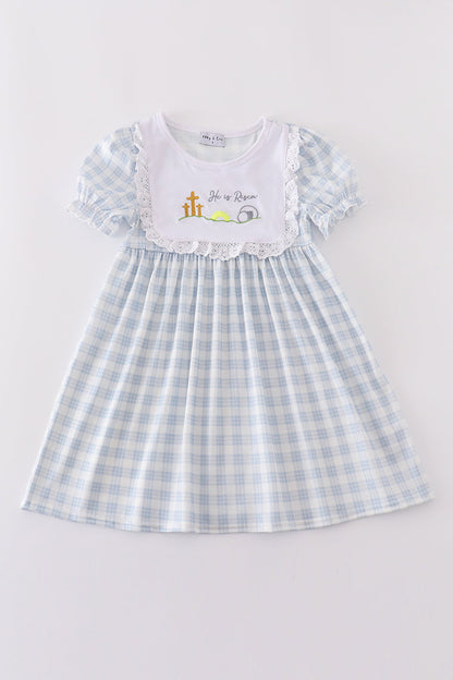 Get ready to turn heads with this unique blue plaid dress! Featuring playful "he is risen" embroidery, this dress is perfect for any occasion.(But seriously, how cute is this?!) Limited stock, so get yours now!