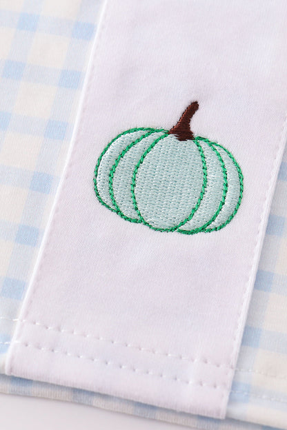 Dress your little pumpkin in this charming boy set featuring embroidered blue pumpkins and a plaid design. This playful outfit is perfect for daily wear and is sure to bring a smile to everyone's face. Plus, the high-quality fabric will keep your little one comfortable all day long.