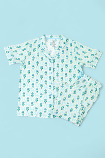 Made from the softest and most breathable seasonal bamboo viscose material, this dreamy nightgown-style set is perfect for winding down and waking up refreshed. Featuring dainty blue and pink blooms tied with sweet ribbon accents, the Blue Ribbon Blooms print brings a soft, feminine touch to your bedtime routine.