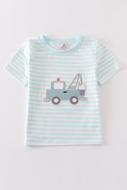 Rev up your little one's style with this cool blue stripe crane truck applique top. Perfect for any playdate or adventure, this top is sure to bring a smile to your child's face. With a unique crane truck design on the front, it's playful and eye-catching.
