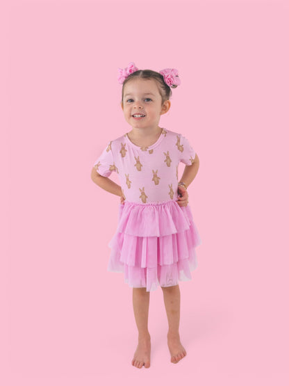 Hop into spring with the Blushin' Bunnies Dream Tutu Dress, the perfect addition to your little one’s Easter wardrobe! This enchanting dress features a playful pattern of soft, brown bunnies with rosy cheeks and sweet pink bows on their ears. The pastel pink background creates a gentle, dreamy atmosphere that will have your little bunny hopping with joy all season long.