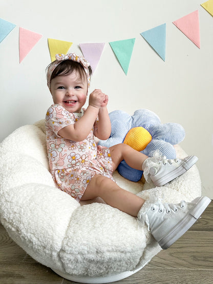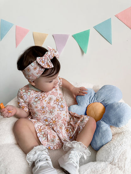 "BUNNY BLOOMZzz" on trend print! NEW STYLE ALERT! Made from the softest and most breathable bamboo viscose material, your babe won't want to take this off! Designed for all the love and extra snuggles! Sleep and play with zero irritation with our tag-less garment tags! Easy diaper changes, you got it-made with 3 easy to remove snaps. We promise you'll love it!