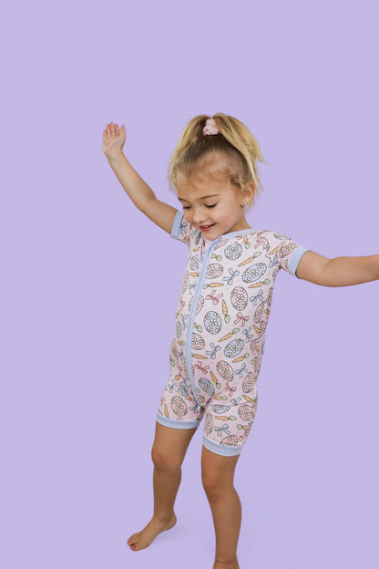 The Easter Daisy Dream Shortie is as sweet as a basket full of Easter treats! Featuring a darling pastel design sprinkled with blooming white daisies, colorful Easter eggs, and the cutest little carrots, this shortie is the perfect blend of springtime magic and everyday comfort. Soft pink bows and tiny pastel stars add an extra sprinkle of whimsy, making it a must-have for your little bunny’s holiday wardrobe.
