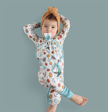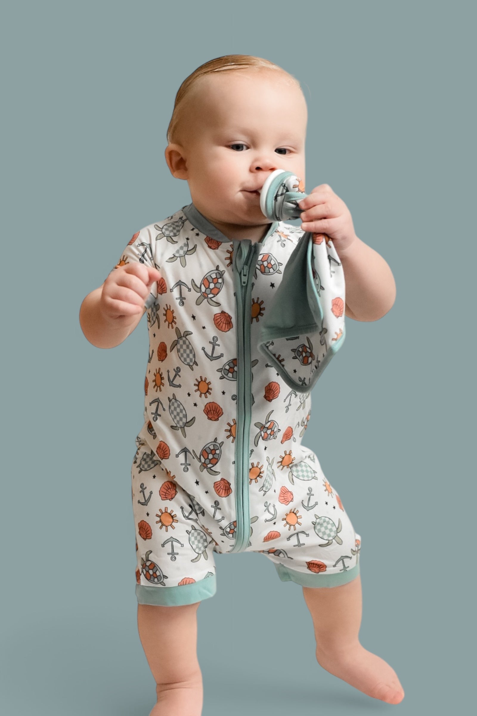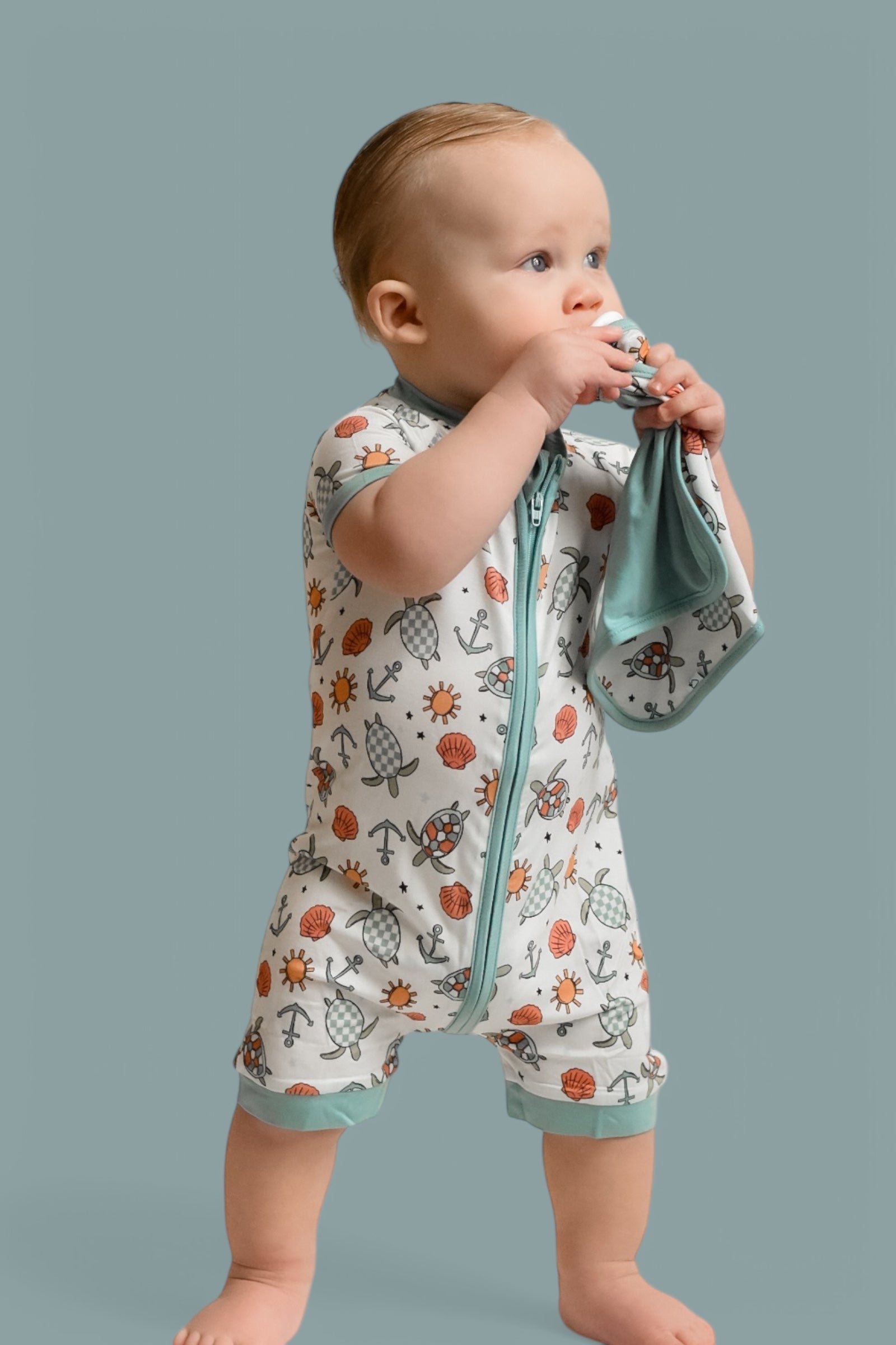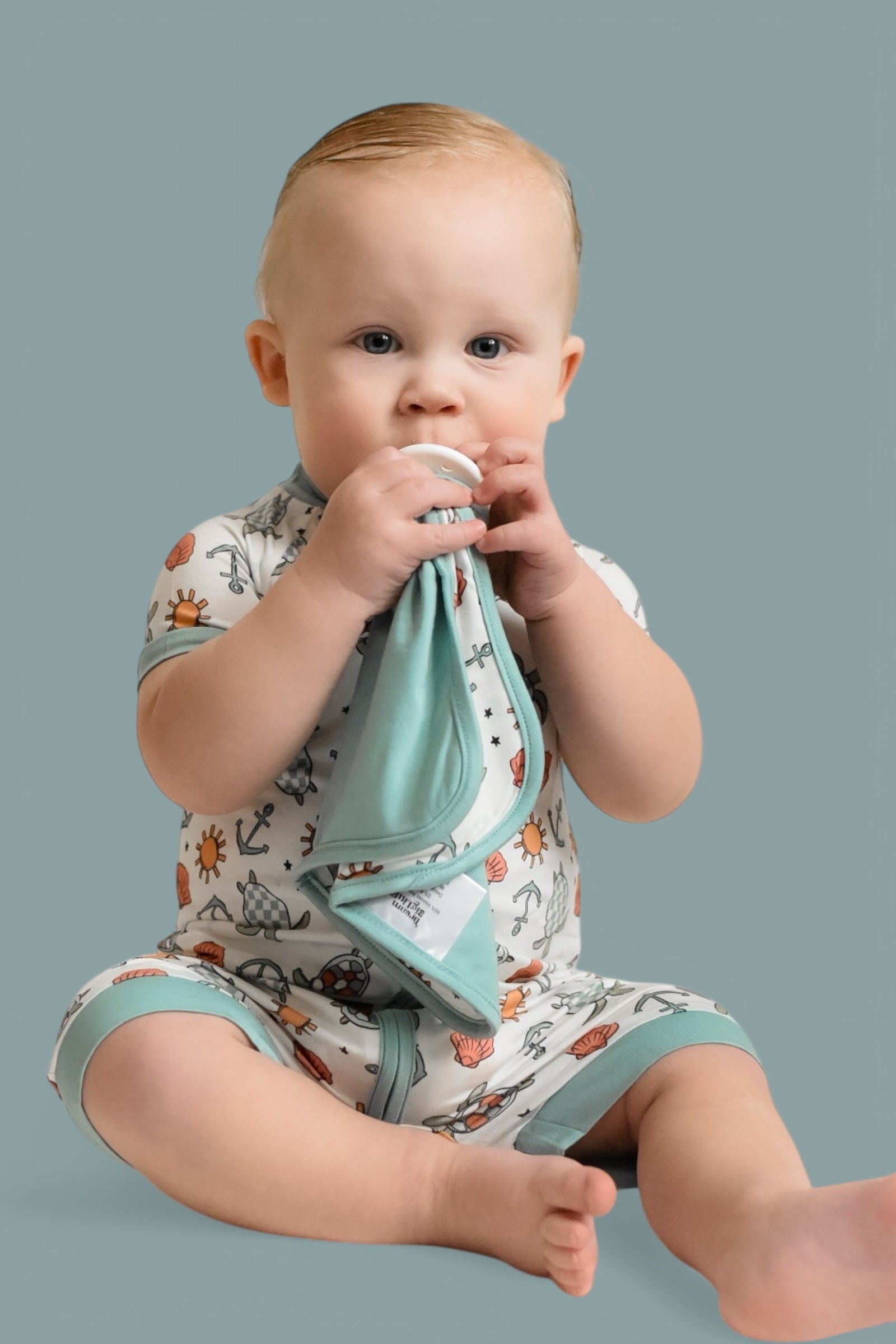 Set sail on a wave of comfort and style with our Exclusive Gimme Some Fin Dream Lovey! Inspired by the tranquil beauty of the sea, this soft, nautical-themed print brings a playful coastal vibe to your little one's nursery. With whimsical motifs like patterned sea turtles, classic anchors, and cheerful suns, this lovey will transport your babe straight to the beach.