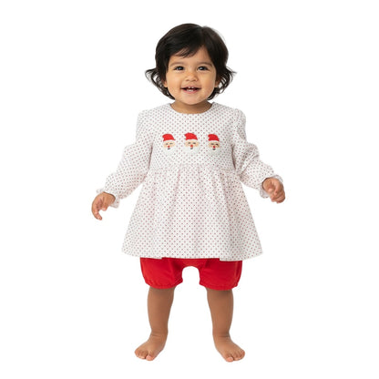The French Knot Santa Bloomer set showcases refined French knot embroidery paired with coordinating bloomers for a classic holiday ensemble. A standout feature is the large bow adorning the back of the shirt, adding an elegant and festive touch. This expertly crafted set offers both comfort and timeless style, ideal for special seasonal occasions.