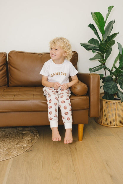 You have the option to choose between a crisp white tee with brown lettering or a stylish brown tee with white lettering to suit your taste. The meticulously screenprinted design guarantees long-lasting wear, allowing your child to proudly support their team throughout the entire season. Whether they're cheering from the sidelines or in the stands, our Gameday Graphic Tee is the ideal choice for young sports fans.