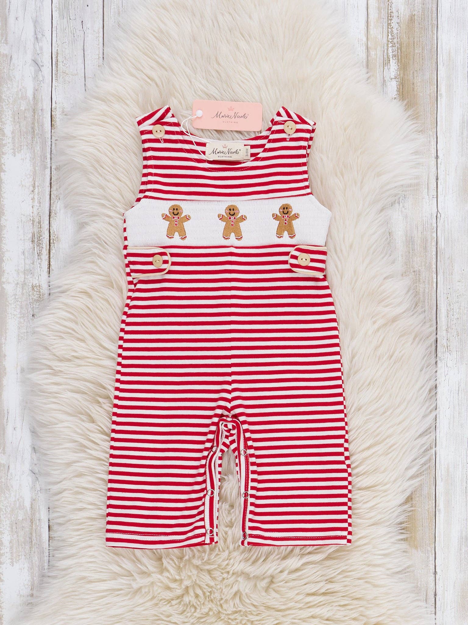 Gingerbread galore! The Gingerbuddies Smocked Overall Romper is candy-cane-striped and super, super sweet. This holiday one-piece by Marie Nicole Clothing features button clasps and a smocked front with little embroidered gingerbread men. With an comfortable overall style, your little boy can also pair it with any top, looking dashing for Christmas and the winter season! * Snap buttons. * Fits true to size.