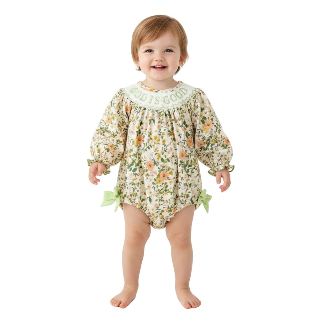 Featuring delightful "GOD IS GOOD" embroidery and a smocked design, it combines softness with style for chilly days. Perfect for playful adventures or special moments, this romper keeps her comfy and cute all season long.