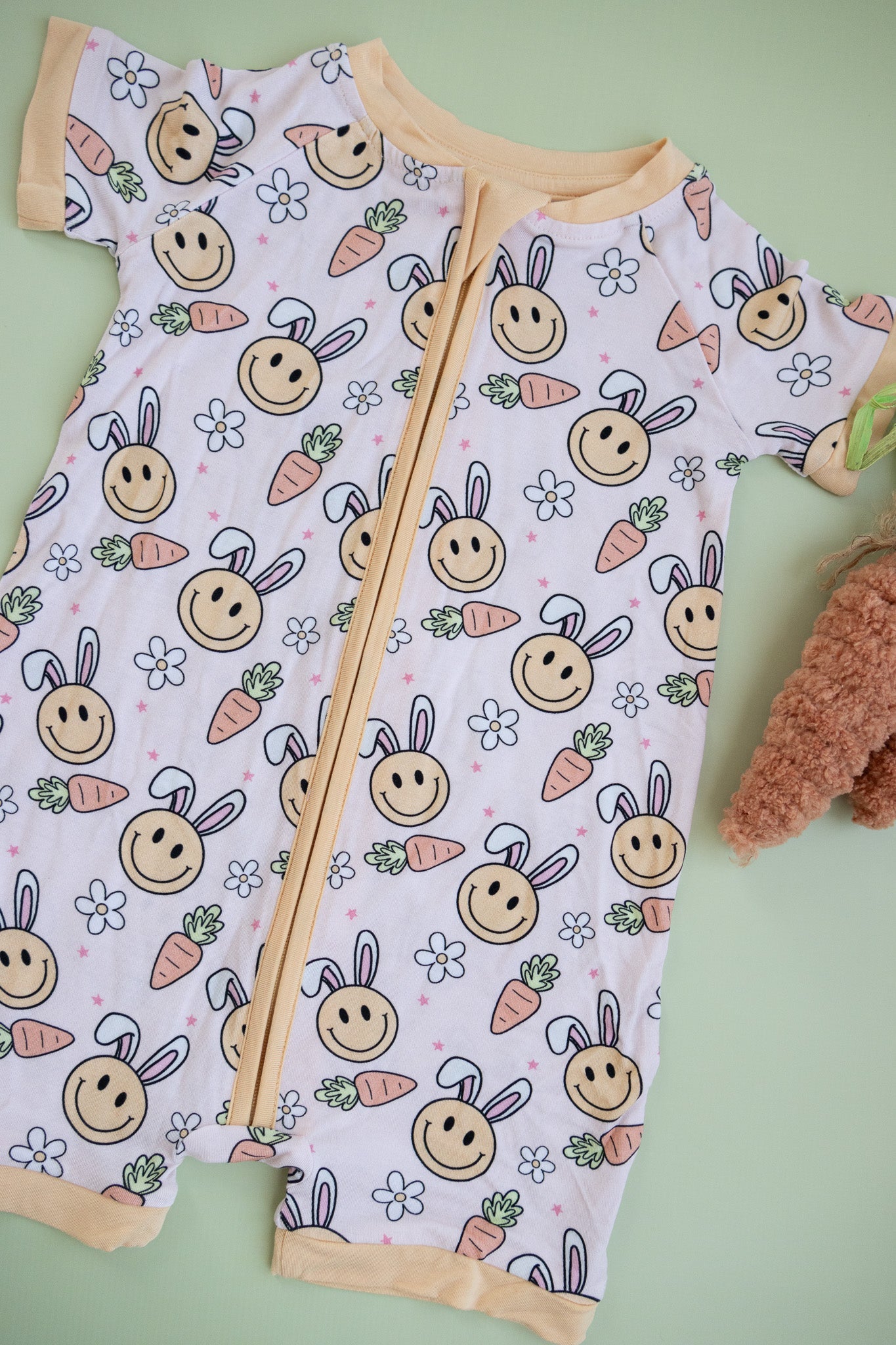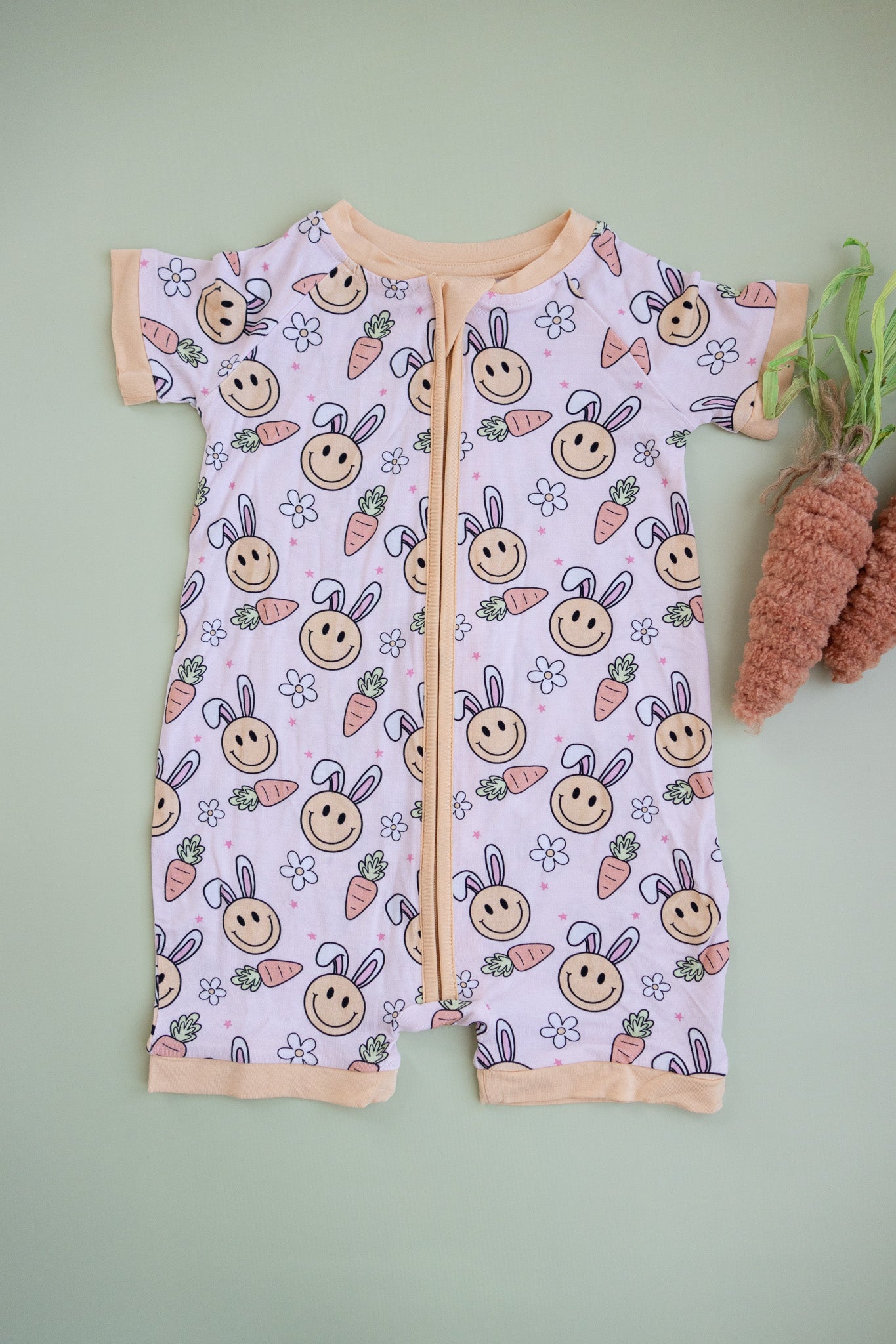 Get ready to HOP into style with our shortie romper! Made from soft bamboo material, this romper is both fun and comfortable. Featuring a festive Easter print with eggs and carrots, you'll be the talk of the holiday (and the most comfortable too)! So don't wait, hop to it and add this dreamy shortie to your wardrobe.
