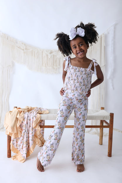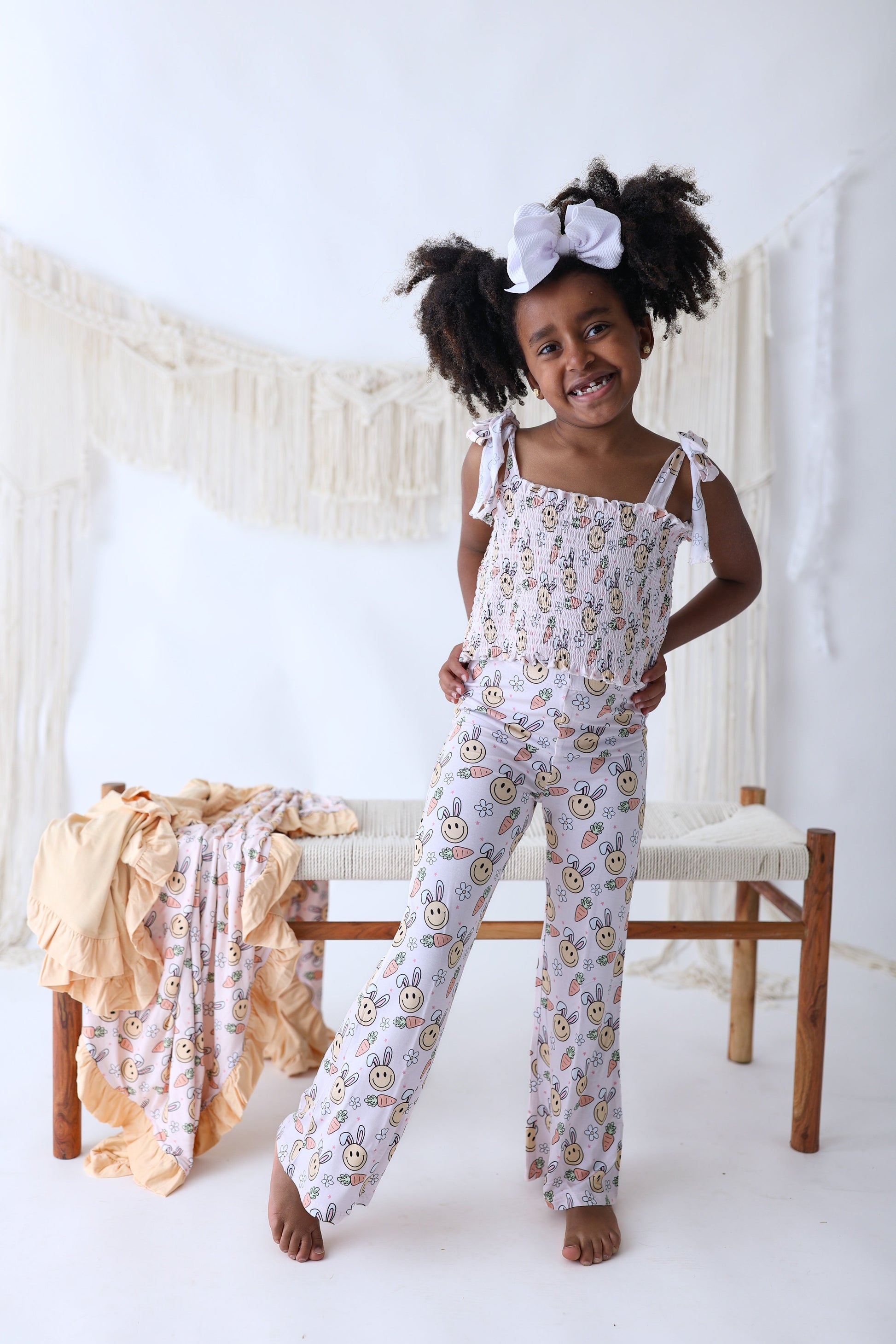 Get ready to hop into Easter with our Hop To It Dream Smocked Flare Set! This two piece flare set features a beautiful Easter print and is made from comfortable bamboo material. Perfect for your little girl's Easter outfit!