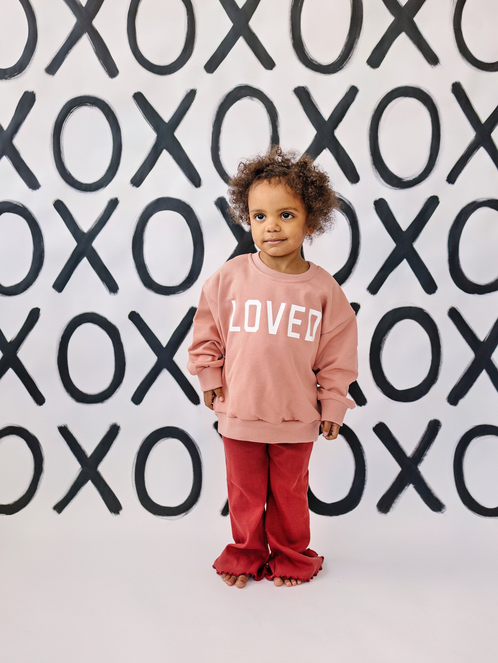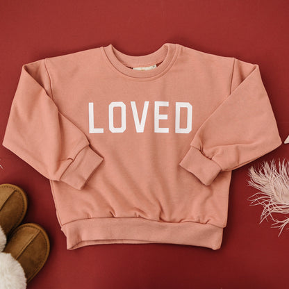 Get ready to celebrate the holidays in style with our 'Loved" Crewneck Sweatshirt. Featuring a charming 'Loved' graphic, this cozy sweatshirt adds a nostalgic touch to your child’s holiday wardrobe. Made from soft, high-quality fabric, it's perfect for layering during the winter months or for wearing to festive events. Available in sizes 6/12 months to size 6, it’s the ideal choice for Valentine's celebrations, family photos, or staying cozy at home. This timeless design will keep your little one both warm and stylish all season long!