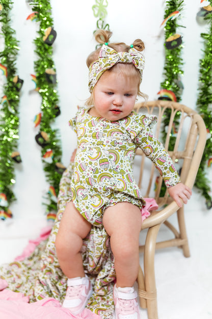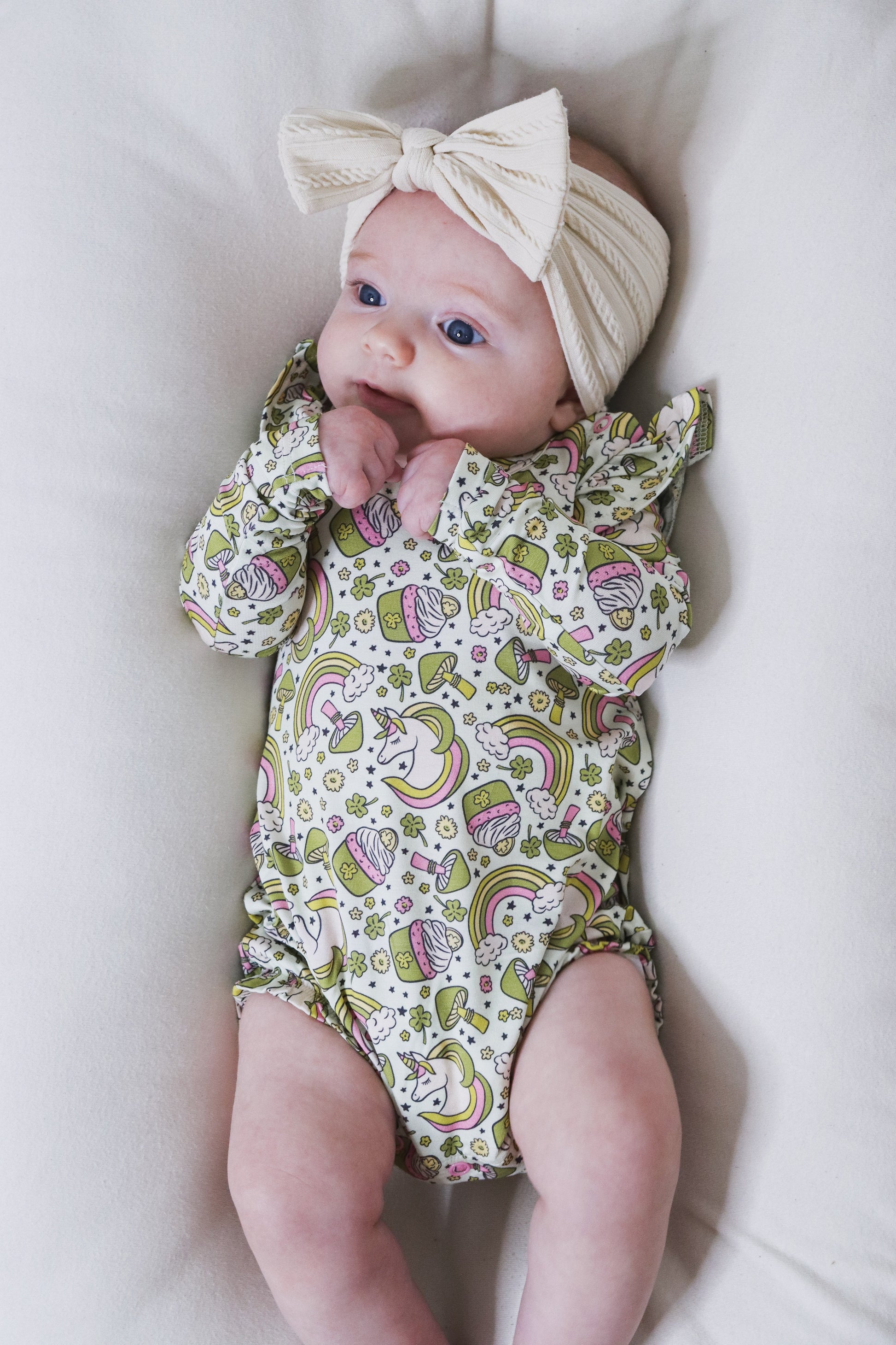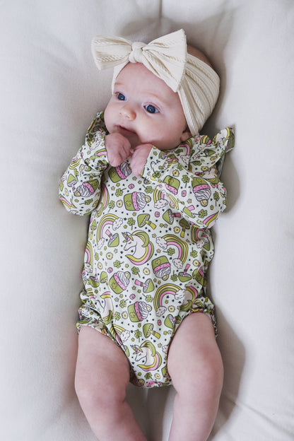 Be the most magical babe around in our Luck Of The Unicorn Dream Bubble Romper! Made from comfortable bamboo material, this long sleeve romper features rainbows and unicorns for a fun and playful look. Perfect for celebrating St. Patrick's Day(or any day, really)!