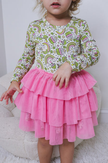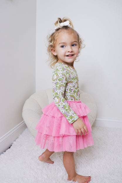 Unleash the magic with our Luck Of The Unicorn Dream Tutu Dress! This long sleeve tutu dress features a playful design of mushrooms, unicorns, and rainbows, perfect for celebrating St. Patrick's and beyond. And with its comfortable fit, your little one will be twirling and playing in style. A truly enchanting addition to any wardrobe!
