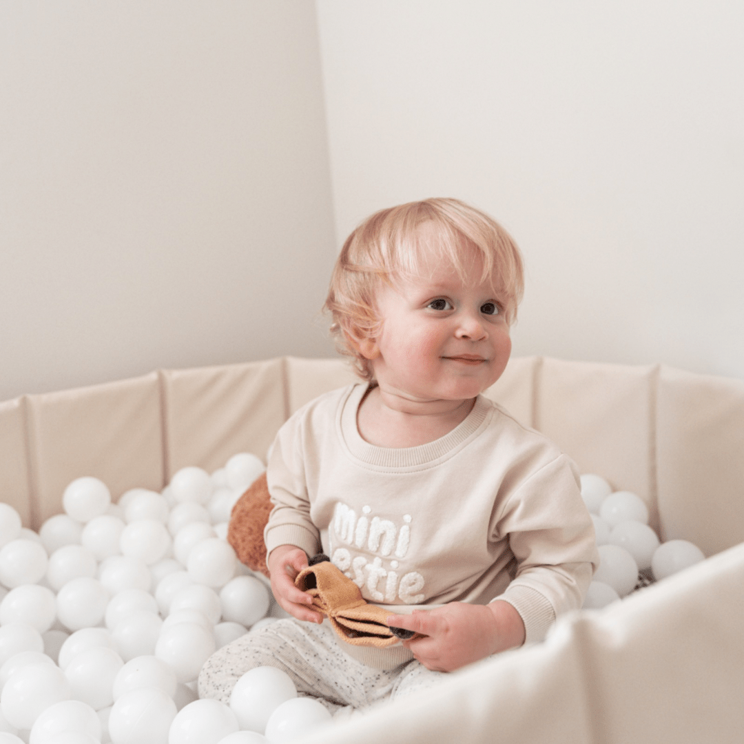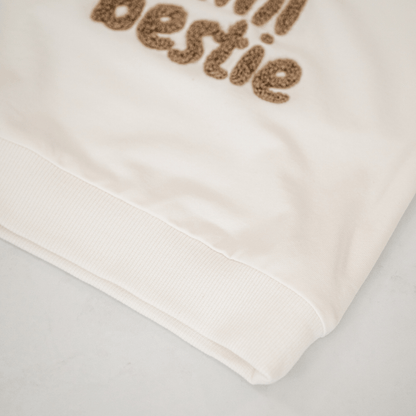 Celebrate a forever friendship with our adorable mini bestie crewneck baby pullover! Featuring fuzzy terry cloth embroidery, this cuddly soft sweatshirt is perfect for both boys and girls. Cute and comfortable, it pairs well with jogger pants, baby jeans, or leggings. Available in natural white or creamy oatmeal, and sizes from newborn to toddler, this unisex long sleeve top is a must-have for any little one.
