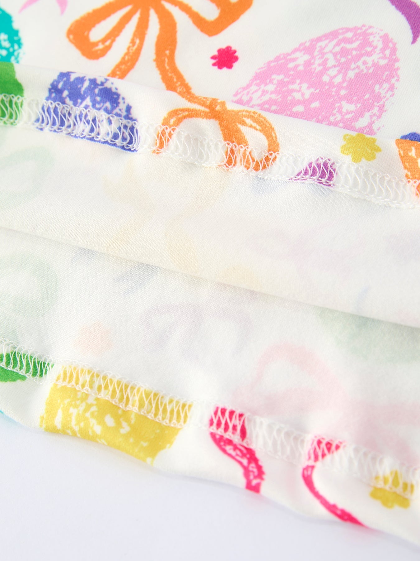 Hop into spring with this delightful two-piece set featuring vibrant rainbow Easter egg prints that capture the joy of the season. The sleeveless vest top showcases a charming bow detail at the neckline, while coordinating shorts complete the playful look. Crafted for comfort and style, this set is perfect for Easter celebrations, spring outings, or everyday wear. The cheerful print and thoughtful design make it an instant favorite for little ones who love festive fashion.