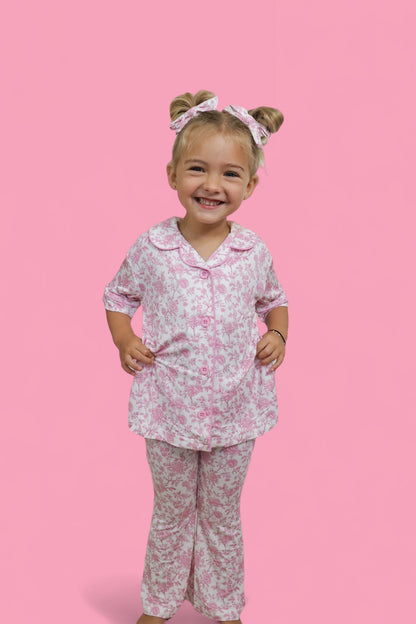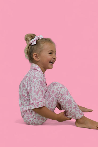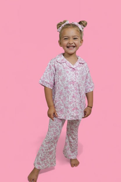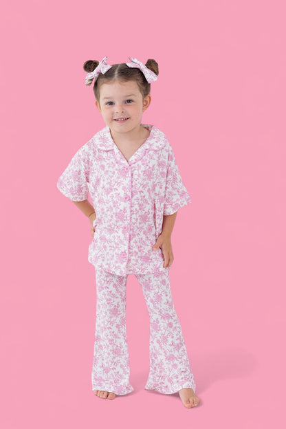 Sweet style meets all-day comfort with our Rosewood Toile Dream Girl’s Flare Set. Designed in a delicate vintage-inspired floral print, this two-piece outfit is made from buttery-soft, breathable bamboo viscose that your little one will never want to take off.