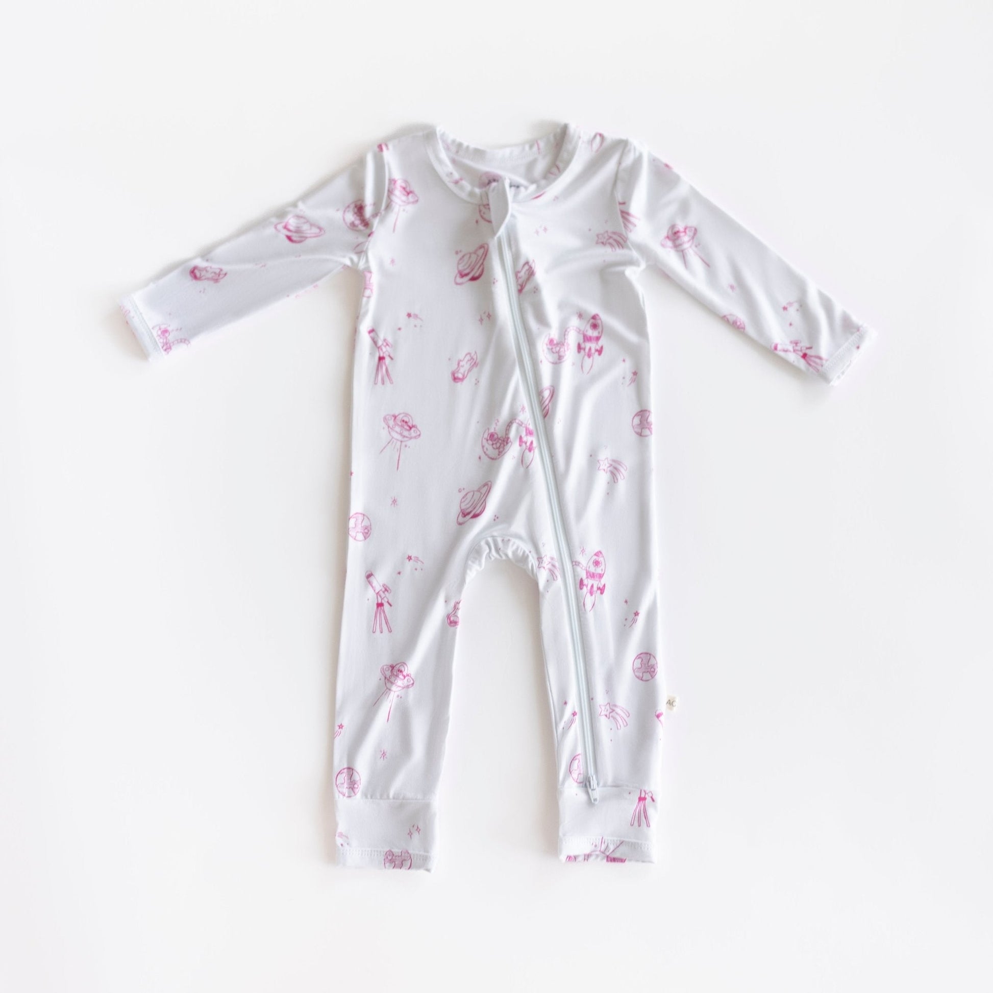 Get ready to take your little ones out of this world with our cozy bamboo pajamas in a cute hand-drawn outer space print, available in three styles: footie onesie, zipper romper, and two-piece set. Made from lightweight viscose from bamboo, these pajamas not only provide ultimate comfort for tiny adventurers of all genders they're also a sustainable fabric. The perfect pajamas for a touch of adorable style and softness.