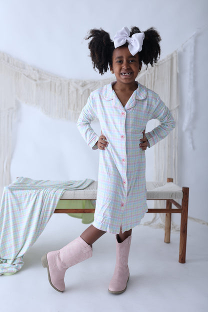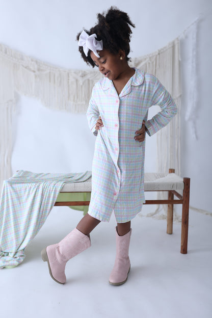 Wrap your little one in the gentle embrace of our Bamboo Spring Gingham Nightgowns, just in time for Easter! Delightfully soft and comfortable, these whimsical creations are perfect for sensitive skin. With a beautiful gingham print, let the playful charm of spring unfold in every bedtime twirl. A cozy, stylish treat for your precious girl!