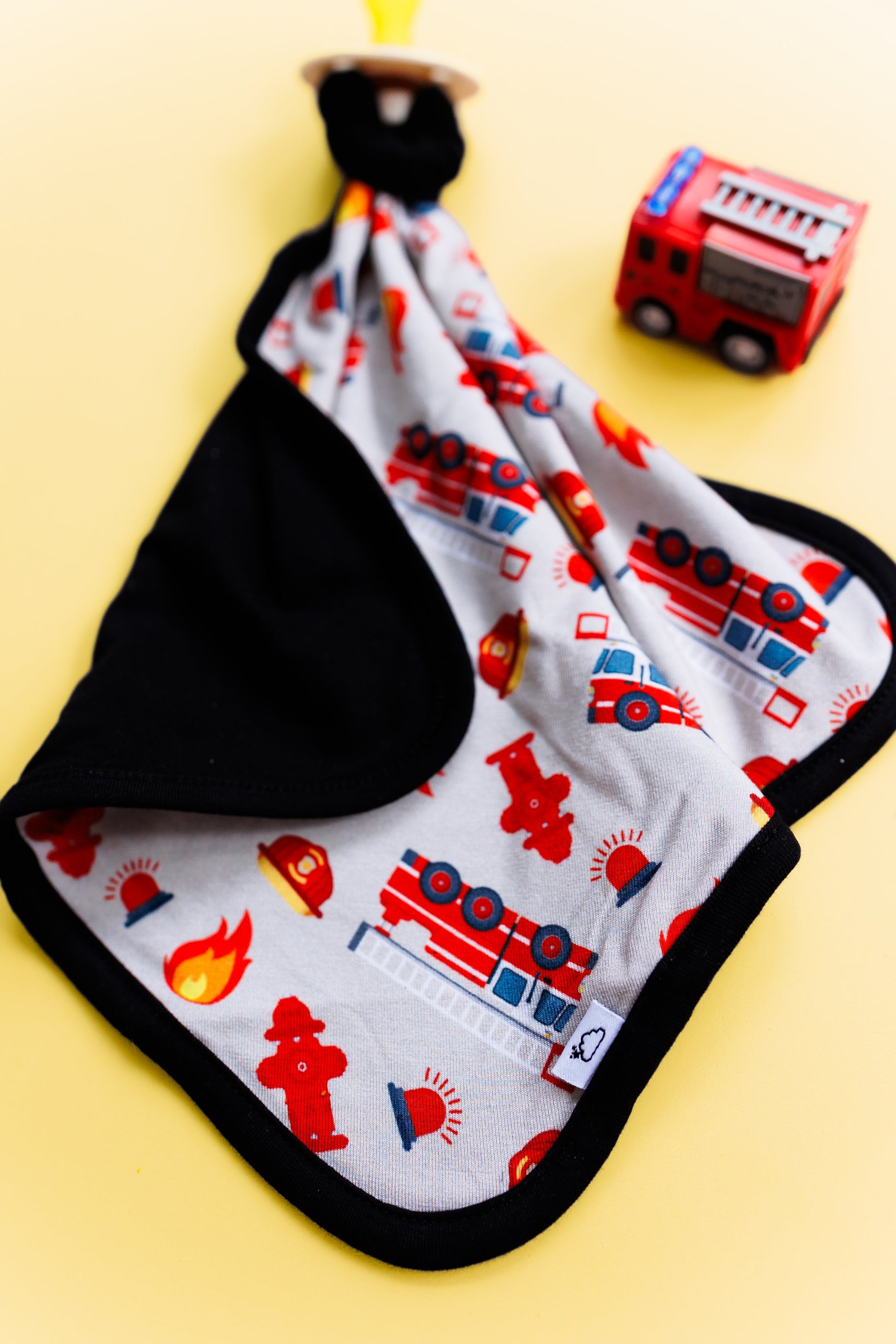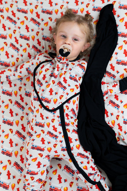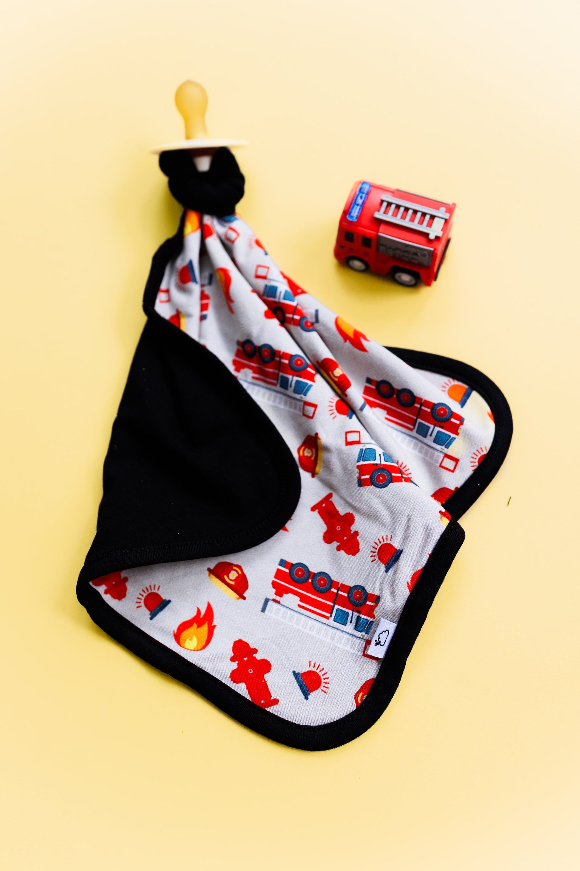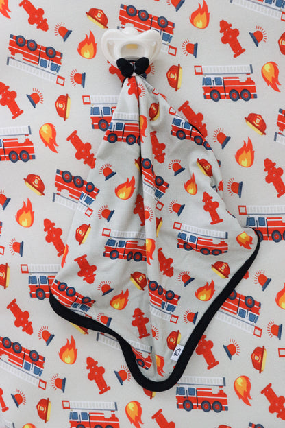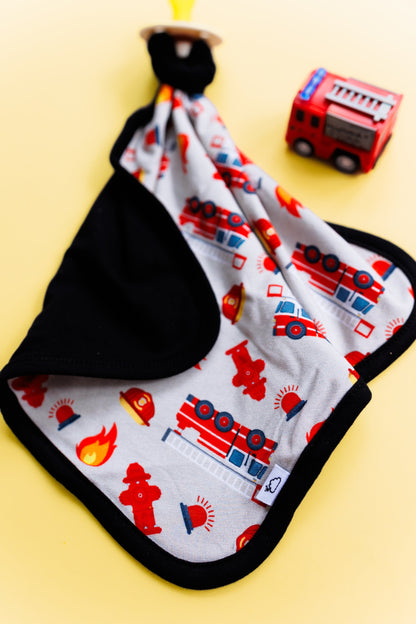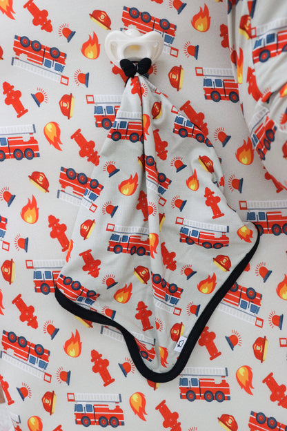 Get your little one ready for dreamland with our Stop Drop & RollZzz Dream Lovey. Featuring a playful fire truck print and a cute firefighter design, this lovey also doubles as a pacifier holder to keep them snuggled and soothed all night long. Made with soft and eco-friendly bamboo material for maximum comfort. Nap time just got more fun!