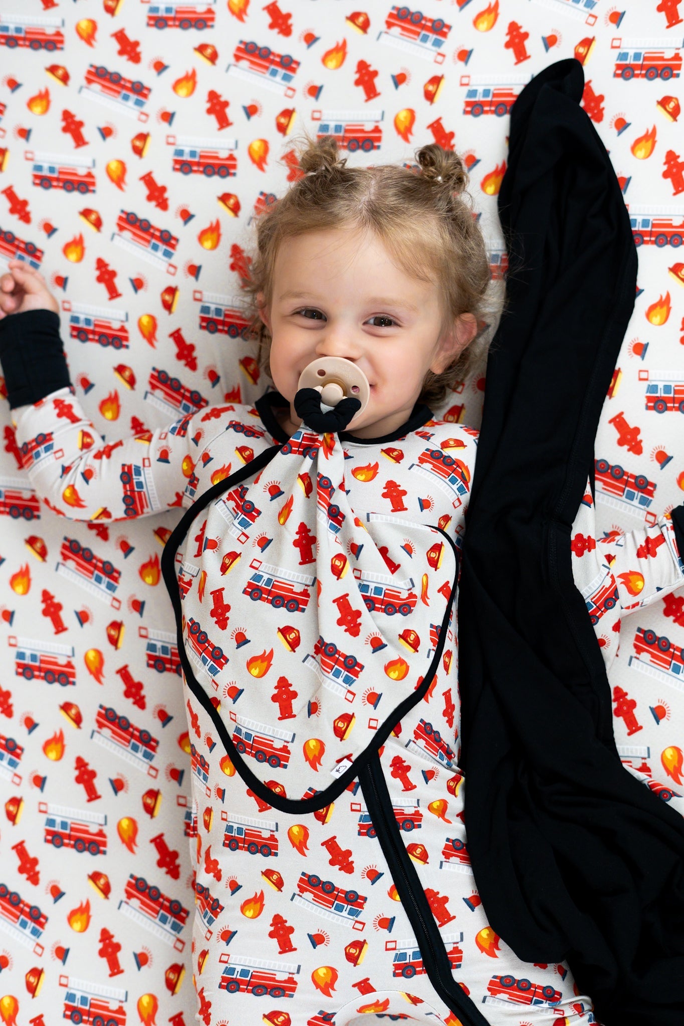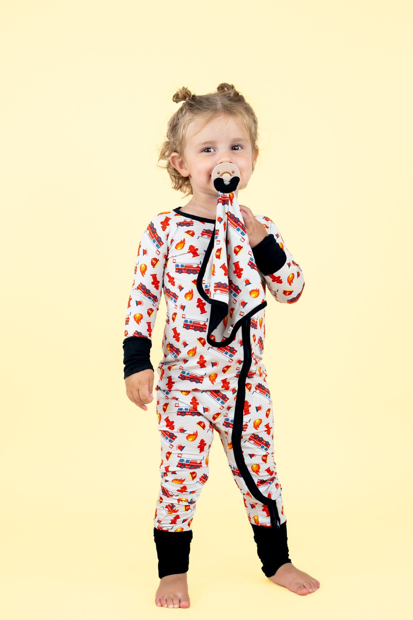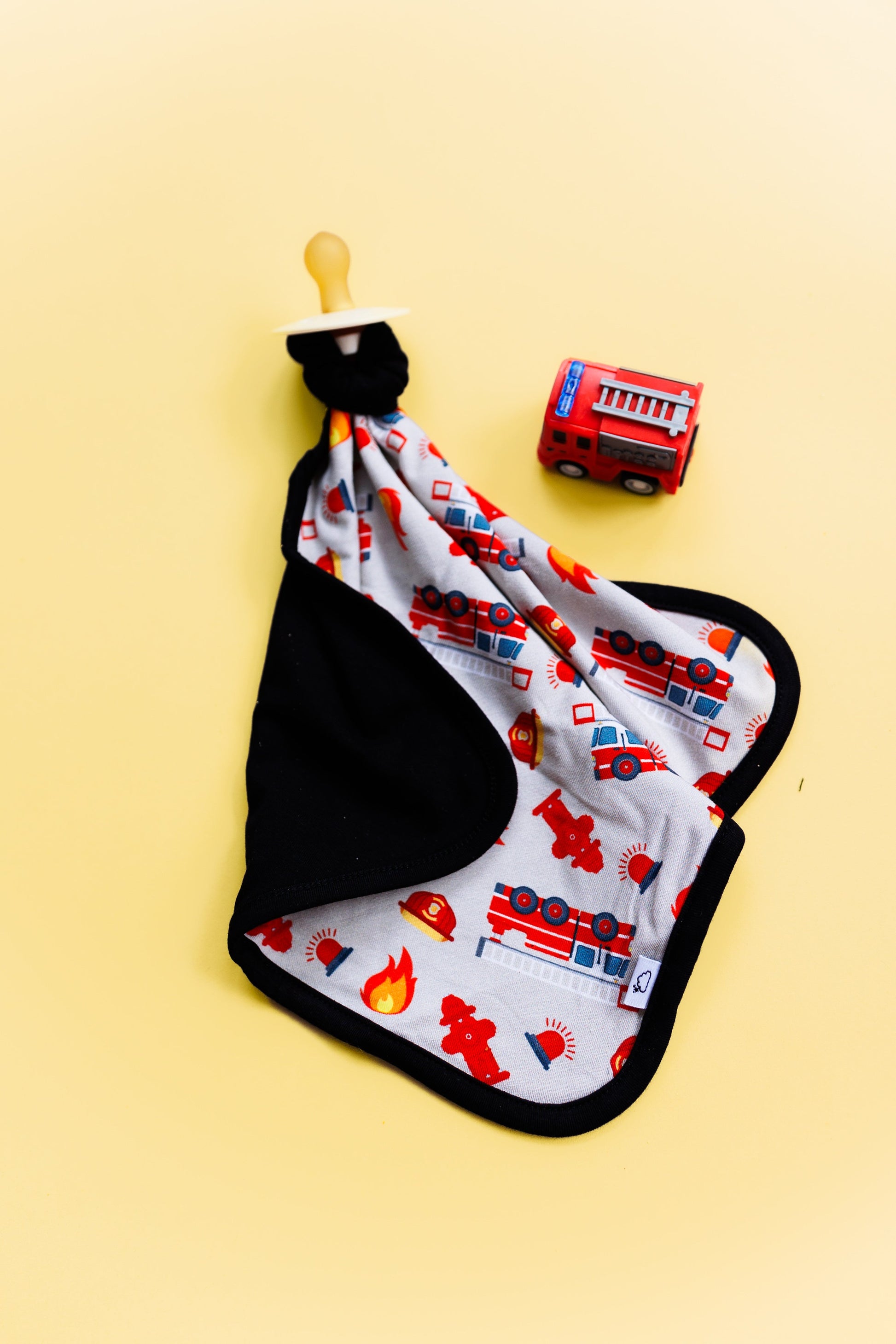 Get your little one ready for dreamland with our Stop Drop & RollZzz Dream Lovey. Featuring a playful fire truck print and a cute firefighter design, this lovey also doubles as a pacifier holder to keep them snuggled and soothed all night long. Made with soft and eco-friendly bamboo material for maximum comfort. Nap time just got more fun!
