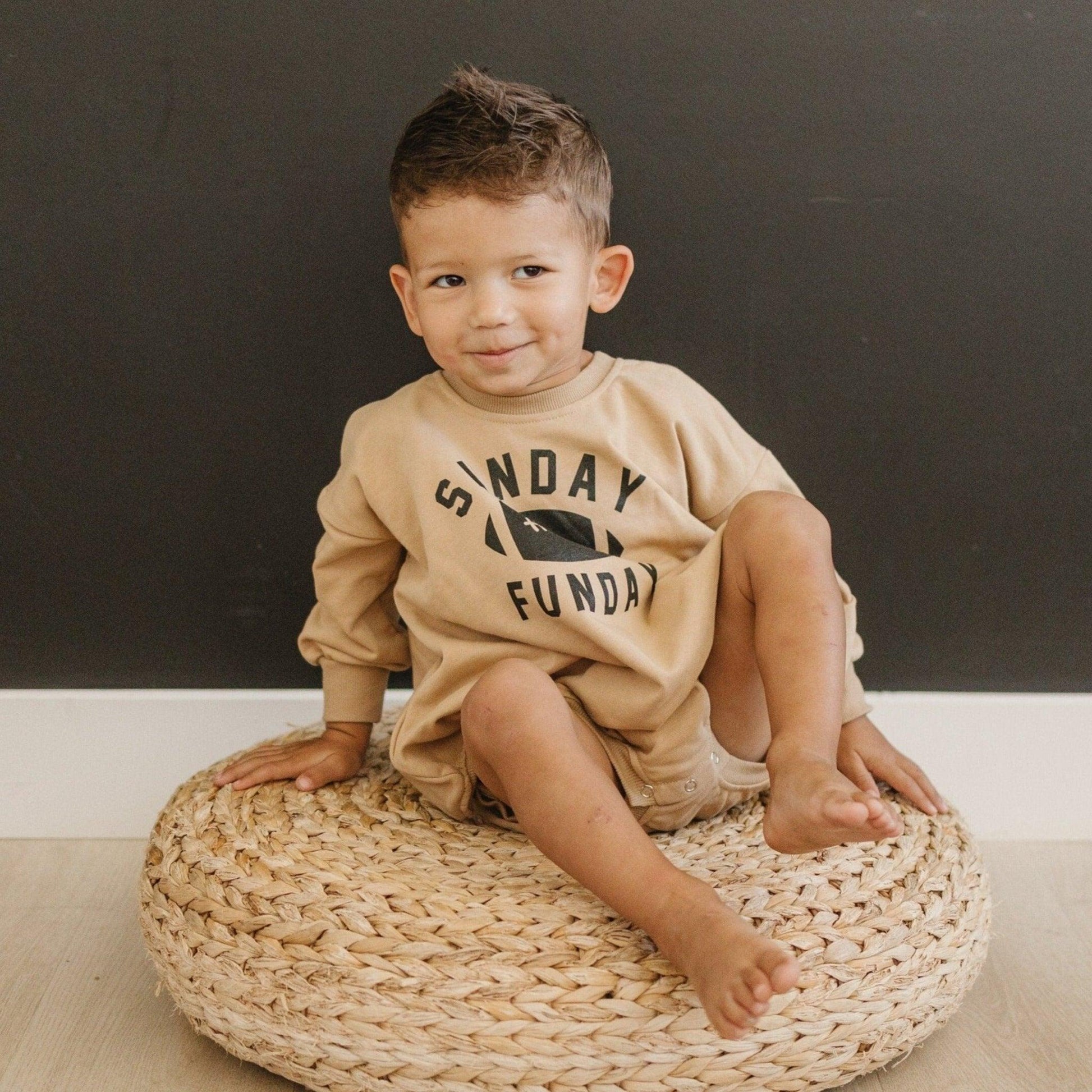 Elevate your Sundays with our "Sunday Funday" Graphic Oversized Sweatshirt Romper. This romper features convenient snaps at the crotch for easy dressing and diaper changes.
