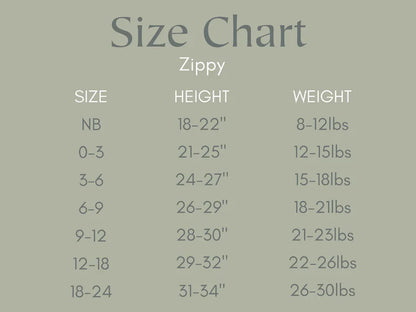 Known for its generous sizing, allowing your little one ample room to move freely, this romper runs large. Consult the size chart in the photos for accurate sizing details. The YKK zipper ensures easy dressing, providing a convenient option for parents. Available in sizes from Newborn to 18-24 months, our Bamboo Zippy Romper is the perfect blend of style and comfort for your baby's everyday adventures.