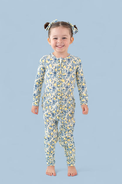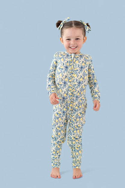 Snuggles, play, and sleep—our Dream Ruffle Romper does it all in the cutest way! Made from ultra-soft, breathable bamboo viscose, this one-piece is designed for all-day comfort and all-night coziness. The sweet Vintage Citrus Toile print in bright pink and orange florals adds a cheerful touch to every moment.