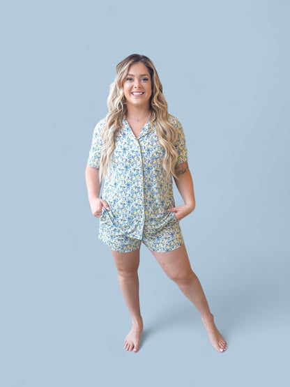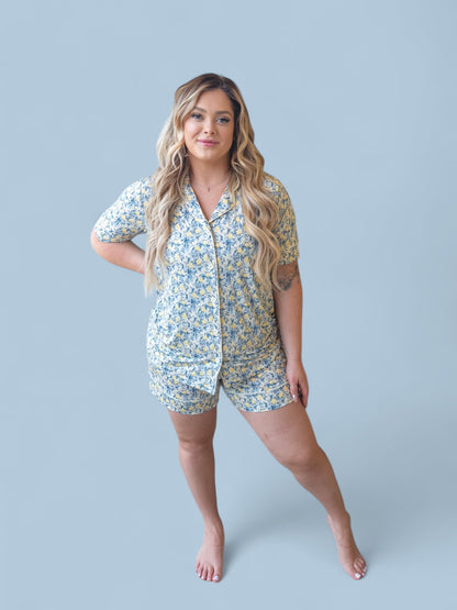 Drift into a reverie of timeless elegance with our Vintage Citrus Toile Women's Dream Short Set. Inspired by the delicate artistry of 18th-century French toile de Jouy, this set marries romantic sophistication with effortless comfort. Featuring an intricate blue floral and botanical motif, accented by sun-kissed golden lemons, this print evokes the charm of a sun-drenched countryside estate.