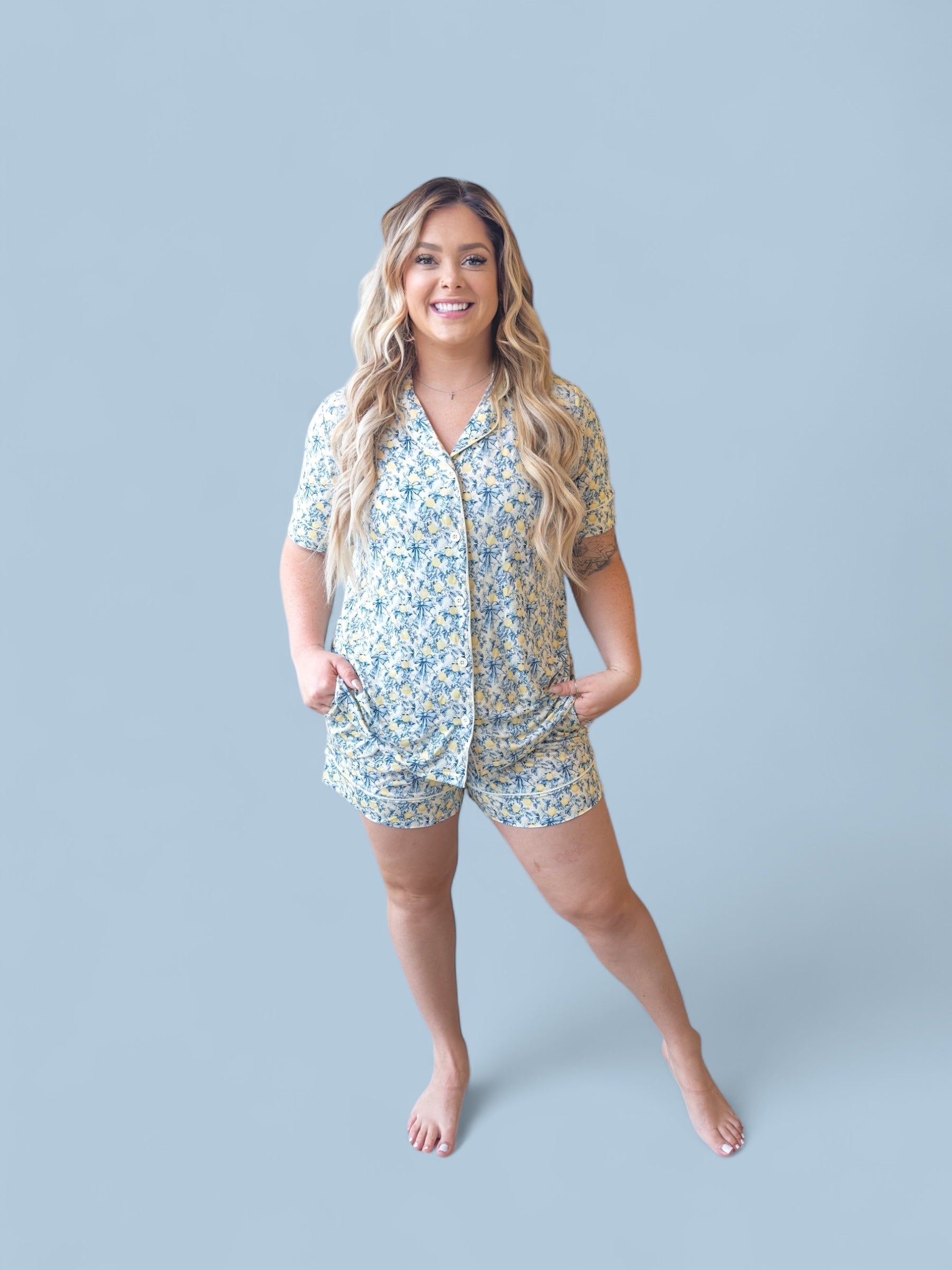 Crafted from the softest bamboo viscose, this breathable and lightweight fabric ensures a luxuriously soft feel against the skin, making it perfect for warm evenings and leisurely mornings. The button-down short-sleeve top offers a relaxed, vintage-inspired silhouette, while the matching shorts feature a functional drawstring and pockets, blending practicality with refined femininity.