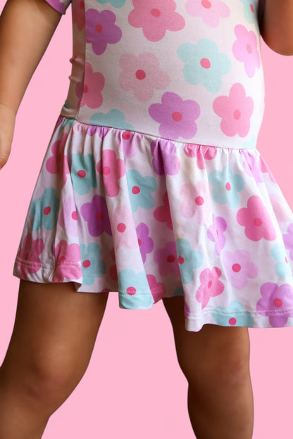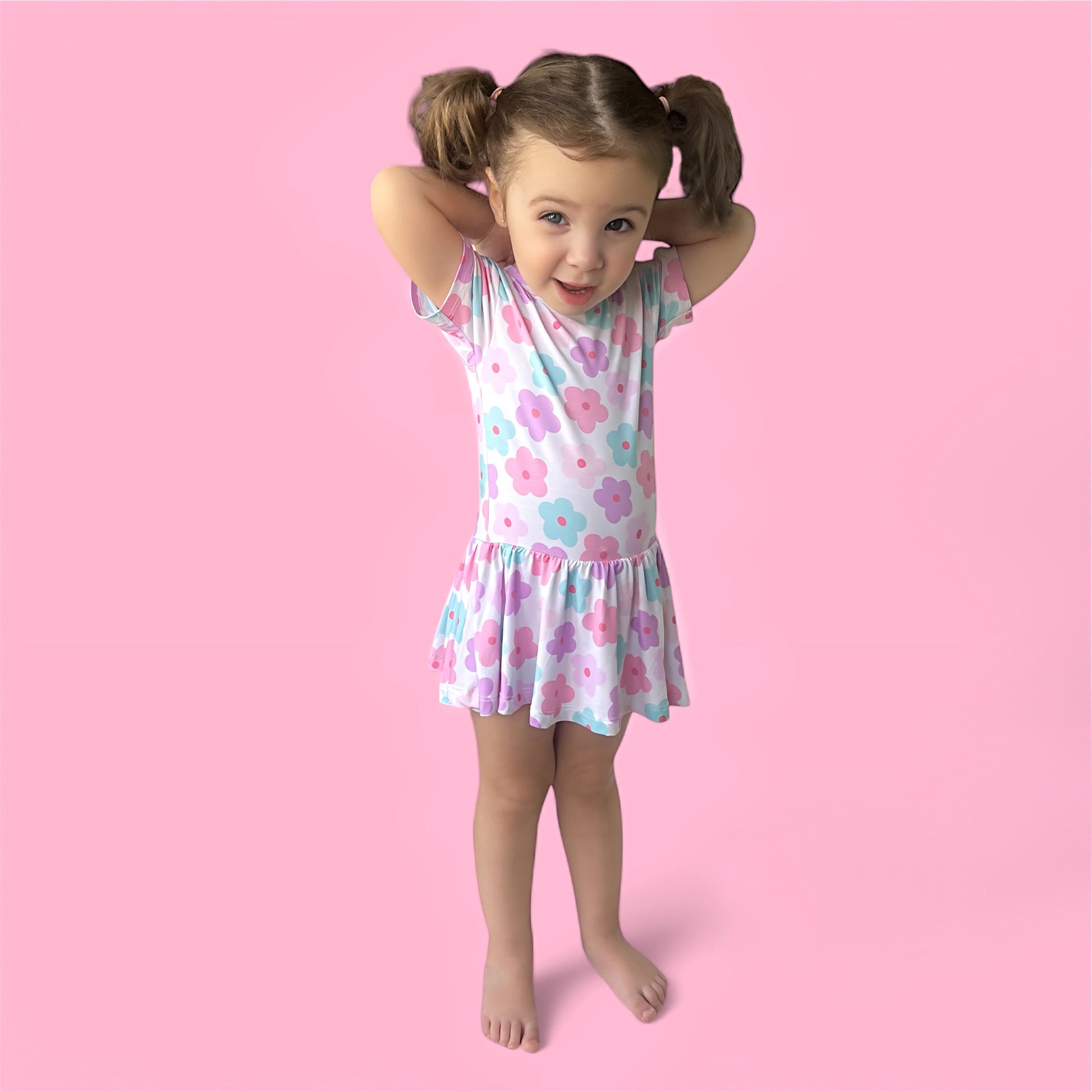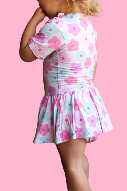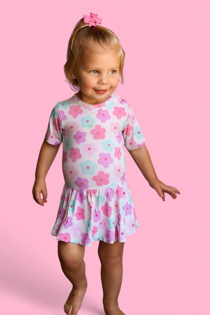 Welcome the charm of spring with the Violet Fields Dream Bodysuit Dress, a delightful fusion of style and practicality. Adorned with a pastel floral print in shades of pink, lavender, and mint, this piece radiates seasonal sweetness. Whether it’s a playdate or a family outing, your little one will look adorable and feel comfortable all day long.